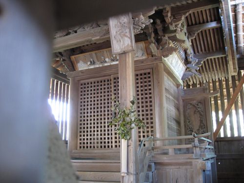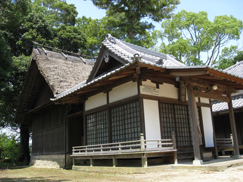社殿は茅葺の覆屋に連結して瓦葺きの拝殿がある。境内東端に公会堂兼参集所の設備があり、当地方としては全般に整った神社である。また、昭和40年代(1965〜1974)まで社頭の一隅に簡易な弓道揚があり、地元愛好家が活用していたが、弓道人口の減少と共に施設を撤去した。