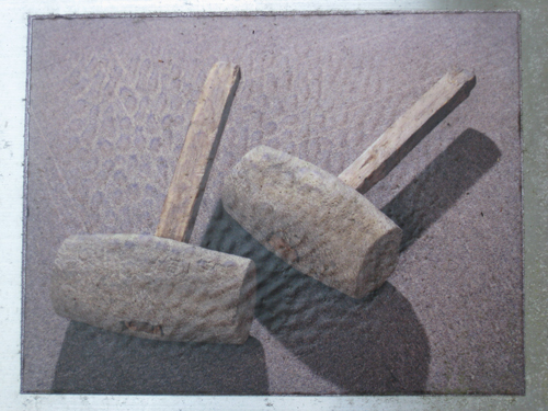 流紋岩質凝灰岩(りゅうもんがんしつぎょうばいがん)で製作されており、二個一対で(全長27.5cm)中央に柄を差し込む穴があいています。胴体の表面には、たがねで形を整えたあとが残り、一つの側面には、「文明二年庚寅」(1470)、もう一つの側面には、「新宮社」と刻んであり、たたき面には彩色の巴紋が描かれています。神社本殿の上棟祭の祭具として使用されたと考えられ、中世吉川の歴史を知る上で貴重な資料となっています。