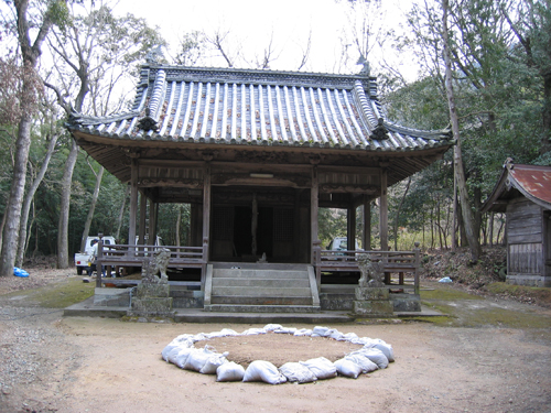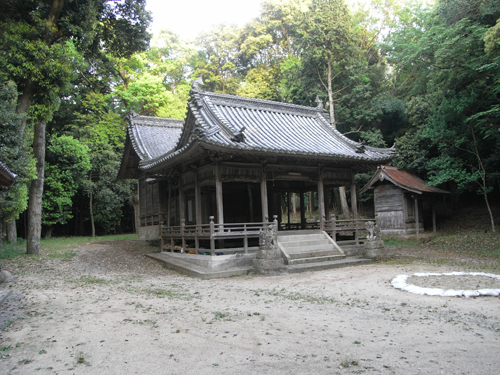 また、古老の話によれば、当社は太尾地区産土の神で360年ほど前に小さな祠を建てておまつりしたのが始まりで、今も昔のままの儀式をなぞらえて1月15日の早朝にその年の無事息災を祈願する習慣が残されている。お当祭りと呼び、これは宮司にかわって宮座的な形でお祀りしたものであろう。元禄12年(1699)に奉献された燈籠が建てられており、その後、天保12年(1841)に神社といえる建物が造営されたとある。明治15年(1882)に本殿が建築され、大正3年(1914)に拝殿が再建された。昭和63年(1988)、甲八幡神社の遙拝所が参道の右側に建てられ、さらに平成12年(2000)、拝殿及び境内社の改築が行われた。その他、神社に関する古文書が30数点保存され、特色ある絵馬も奉納されている。 |
