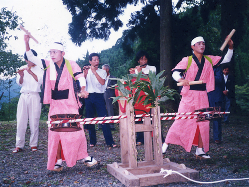 | 当日の午後3時頃より、村の若者衆による「練り込み」が、村内を一週して、神社に奉納。そのあと境内で景品付きの「もちまき」大会があります。 |