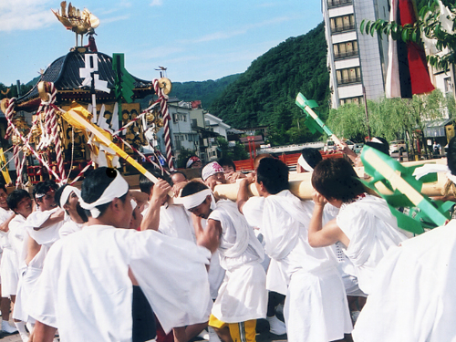 ◆御例祭=毎年9月15日に斎行。午前9時より例祭本祭り斎行。午前10時より古来伝承の「お當講」「石灯籠講」なる講中の宅神祭を奉仕。午後1時より神幸式発輿祭を行い神輿を始め真榊台、太鼓壇尻等が市街へ出発し、氏子内全域を巡幸する。太鼓壇尻は地域子供会員約60名が奉仕。「湯村八幡壇尻歌」を合唱しながら賑やかに巡幸。また神輿・榊台は地域消防団員を中心とした若者約80名が奉仕。途中街中の所々で神輿と榊台との激しい「ぶちかまし」を行い乍ら賑やかに巡幸する。午後5時過ぎ頃神社に帰着。還幸祭を斎行して全ての祭事を終了する。 |